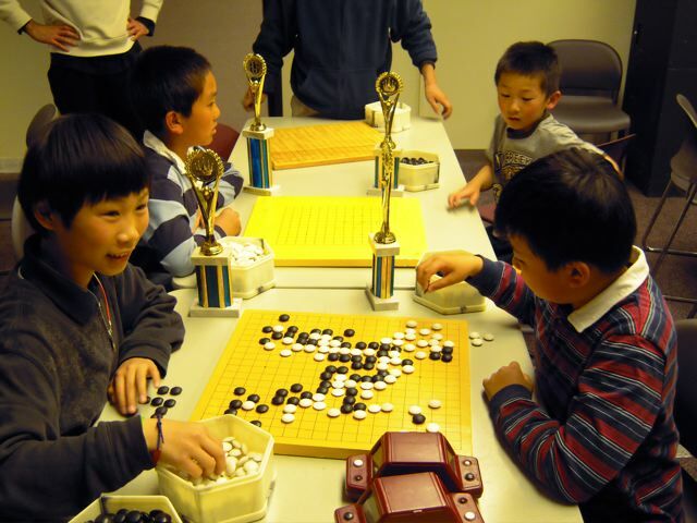 Nathan Harwit 3d and Luke Zhang 1d topped their divisions at the Boulder, CO, United States Youth Go Championship (USYGC) this past Saturday, April 24. Harwit, age 12, beat his twin brother Matthew to take the regional title. The boys have alternated as champion for the past four years, and this is their first year in the Senior Division. Nine-year-old Luke Zhang 1d took top honors in the Junior Division. Six-year-old Robin Luo 7k, also made a strong showing, winning a special trophy in the under 12 division. Winners Report: 1st: Nathan Harwit 3d; 2nd: Luke Zhang 1d; 3rd: Matthew Harwit 4d; 4th: Erwen Yu 13k; Special Under 12: Robin Luo 7k; Newcomers Award: Lenny Den 18k. - Paul Barchilon, E-J Youth Editor; photo: Prize winners relax after their matches at the Boulder USYGC. From left to right: Erwen Yu, Luke Zhang, Robin Luo, Lenny Den; photo by Dave Weiss
