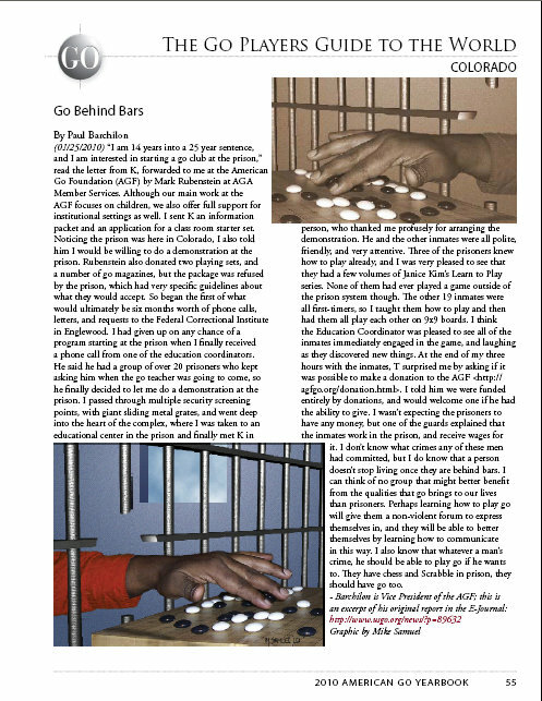 The "Go Player's Guide to the World" section of the 2010 American Go Yearbook has just been released (click here or on graphic at right). The 3-page PDF includes both of Paul Barchilon's reports on teaching go in prison and Roy Laird's report on the Chess and Checkers House in New York City's Central Park. We've also included handy clickable links to our Traveling Board reports from China last year as well, previously released in the 2010 WAGC special report. As previously reported, the Yearbook is being issued in an online PDF version only this year, and we’re releasing sections as they become available, as well as the entire Yearbook PDF when it’s completed. There’s also the previously-released wealth of member’s-only material published online in 2010. From the complete collection of 2009 game commentaries to the 2010 WAGC, US Go Congress and Cotsen Open commentaries as well as all the 2010 game commentaries published in the E-Journal (recently completely updated), a treasure trove of great go material is just a click away! See below for links. This material is provided as a benefit of membership in the AGA; you are welcome to download as many copies for personal use as necessary, but please do not distribute.2009 GAME COMMENTARY COLLECTION: all the 2009 EJ member’s edition material is collected here online for easy access anytime; this replaces the CD that used to be published with the annual American Go Yearbook. 2010 MEMBER’S EDITION COLLECTION OF GAMES, COMMENTARIES & MORE: up-to-date collection of all Member’s Edition content from 2010 posted for review online or download. WORLD AMATEUR GO CHAMPIONSHIP SPECIAL EDITION: the American Go Yearbook’s first-ever World Amateur Go Championship Special Edition, an 18-page full-color PDF report on the 31st annual World Amateur Go Championship held May 24-31 in Hangzhou, China. The Special Edition is a compilation of the coverage of the WAGC by the American Go E-Journal/Ranka Online team — suitable for online viewing or printing out — and includes reports, photos and embedded clickable links to game commentaries by Michael Redmond 9P and the complete online coverage by both the E-Journal and Ranka. U.S. GO CONGRESS SPECIAL EDITION: the Yearbook’s 2010 U.S. Go Congress Special Edition, a 31-page full-color PDF report, covers the 21st annual U.S. Go Congress, held August 1-8 in Colorado Springs, Colorado. The Special Edition is a compilation of all the coverage of this year’s Congress by the American Go E-Journal and includes reports, photos and embedded clickable links to game commentaries by visiting professionals. Also included are clickable links to U.S. Open and Ing crosstabs. COTSEN SPECIAL EDITION: the American Go Yearbook’s third Special Edition of the year, covering the September 19-20 Cotsen Open in Los Angeles. The full-color 5-page Cotsen Open Special Edition compiles all the E-Journal’s 2010 Cotsen coverage, including clickable links to 20 game records — including several game commentaries — photos and the complete final winner’s report. - Chris Garlock, with special thanks to Brian Kirby for building and maintaining the online game collections