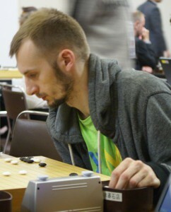 Round 6 began at 1:30pm on May 31 with China’s Baoxiang Bai and Chinese Taipei’s Tsung-han Wu squaring off. One of those two was about to lose his unbeaten status. Next to Bai and Wu, Korea’s Woo-soo Choi was paired against Poland’s Kamil Chwedyna (photo at right). One of those two players was about to lose his second game of the day, after four straight wins in the first half of the tournament. The Polish player drew white and placed his first three stones on the 9-10, 11-10, and 4-2 points, while the Korean occupied three corners. On three other boards in the main playing room, Japan’s Hironori Hirata was playing Spain’s Joan Flos, Thailand’s Choltit Rattanasetyut was playing Vietnam’s Kanh Binh Do, and France’s Thomas Debarre was playing Eric Lui of the US. The winners of these games would still be very much in contention, provided one of them could manage to beat the winner of the Bai-Wu game. In the outer playing area the Ukraine’s Mykhailo Halchenko had been drawn down against Romania’s Cornel Burzo. A win for the Ukranian would leave him in contention for the championship too. A win for the Romanian would mean a good chance at taking one of the top ten places, conditional on a strong performance tomorrow. Sixteen other players with 3-2 records were also playing for chances to finish in the top ten. With the stakes becoming increasingly clear, the pace of play slowed. Only a few games finished in less than two hours. Two of these ended in victories for Japan and Korea. At the two-hour ten-minute mark the Southeast Asian showdown between Thailand and Vietnam was also over, and in this game victory went to Thailand, by 9.5 points. By this time a crowd of over thirty onlookers had gathered around the game between the unbeaten duo from China and Chinese Taipei, Baoxiang Bai and Tsung-han Wu. The situation on the board was becoming increasingly uncomfortable for Chinese Taipei, and after another ten minutes Wu resigned, leaving China’s Bai in undisputed first place, at least for the present. Thomas Debarre and Eric Lui are both relatively slow players, and their game lasted longer. The winner was Eric Lui. His reward: a pairing against the Chinese player in round 7. In the outer playing area, the drawn-down game, another lengthy affair, was won by the drawn-up player, Cornel Burzo. Tomorrow he will first face Kanh Binh Do of Vietnam in a quest to restore Romania to a place in the top ten. In other pairings for round 7, Korea is matched against Chinese Taipei and Japan against Thailand.