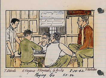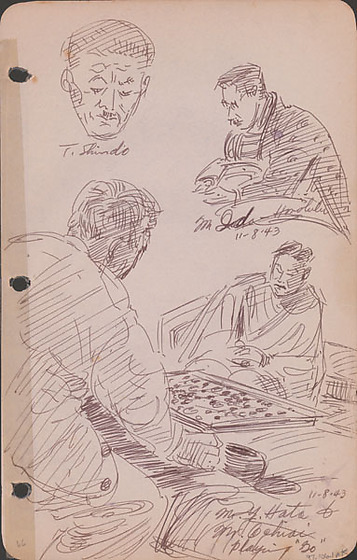 website. George Hoshida (1907-1985) was born in Japan and at the age of five, his family settled in Hilo, Hawaii. As an active practitioner of Judo, Hoshida was active at the local dojo. This led directly to his arrest by FBI agents on the day after the bombing of Pearl Harbor as a potential saboteur. Unlike most Japanese Americans living in Hawaii, Hoshida was incarcerated for the duration of the war, first at Kilauea Military Camp and Sand Island in Hawaii and later in mainland Justice Department internment camps at Lordsburg and Santa Fe, New Mexico. Eventually, he was able to rejoin his wife and young daughters, but only when they agreed to leave Hawaii to be incarcerated with him in a War Relocation Authority camp on the mainland. Hoshida began a visual diary of his incarceration from his earliest days in prison. The two notebooks in the collection of the Japanese American National Museum are an extremely rare visual document of the special Justice Department camps and chart his frequent movement from one facility to the next. (Hoshida bio courtesy the