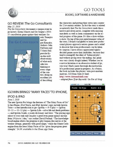 Go Tools(left) is a comprehensive 10-page PDF containing reviews of go books, software and more, complete with handy clickable links. This is the first time in several years we’ve published this section, and we think you’ll find it a useful compilation. The 2010 American Go Yearbook is being issued in an online PDF version only, and we’ve been releasing sections as they become available. See below for the nine sections already published; a single PDF will be published when the 2010 Yearbook is completed.