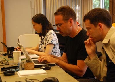 photos: Main playing area (left); Michael Redmond 9P (r) and Jennie Shen 2P (l) do live game commentaries (r) on top U.S. Open games Thursday morning on KGS with EJ Managing Editor Chris Garlock; photo by Todd Heidenreich