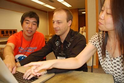 photo: Ryo Maeda 6P (left) and Li Ting 1P (right) comment a game on Friday, August 5 with EJ staffer Solomon Smilack. Photo by Chris Garlock