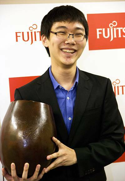 At just 18 years old, Park has not only taken his first major international title, but has also broken Lee Sedol Park Younghun 9P's record as the youngest player to win the Fujitsu Cup. However, he is not the youngest ever to win an international title; that record is still held by Lee Changho 9P. En route to the final, Park also defeated Ogata Masaki 9P, Chen Shiyuan 9P, Piao Wenyao 9P and Iyama Yuta 9P. Qiu, for his efforts, will be promoted to 9P for reaching this final. - Jingning; based on her original reports on the 24th Fujitsu Cup, at Go Game Guru. Photos: Upper right; Qiu Jun 8P (left) and Park Junghwan 9P. Below; Park Junghwan 9P holds the Fujitsu Cup.