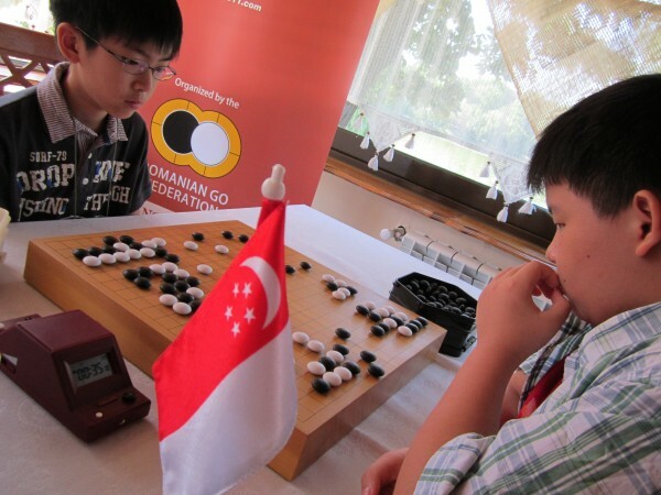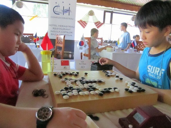 China is at the head of the pack in this year's World Youth Go Championship, in Bucharest, Romania, with a first place lead in the Junior Division, and a finalist in the top 4 in the Senior. Round 2 saw Liao Yuanpei 5d (China) take an early lead by defeating Shibano Toramaru 6d (Japan) in the Junior Division (under 12), while Ke Jie 2P (China), Koyama Kuya 6d (Japan) and Cheng Cheng-Hsun 7d (Chinese Taipei) all won their games in the Senior division. Yuanpei continued his lead in rounds 3 and 4, by defeating Chinese Taipei and Korea in the Junior, while Cheng-Hsun pulled a surprise upset in the Senior Division, by defeating 13-year-old Chinese pro Ke Jie, but then lost to Japan's Kuya in Round 4, who in turn was defeated by Ke Jie in round 5. The top four in each bracket are now set for the finals: China, Japan, Korea, and Chinese Taipei in the Senior; China, Chinese Taipei, Korea, and the US in the Junior, which will be held Wednesday Aug. 17th. American Junior contestant Aaron Ye 4d won entry into the finals by a stroke of luck - he drew China as his first opponent, a game he lost, but then gained three wins in a row by competing against other kids who had lost, narrowly edging Shibano Toramaru 6d (at left, in photo below, in his match against Singapore's Yi Fei 3d).
