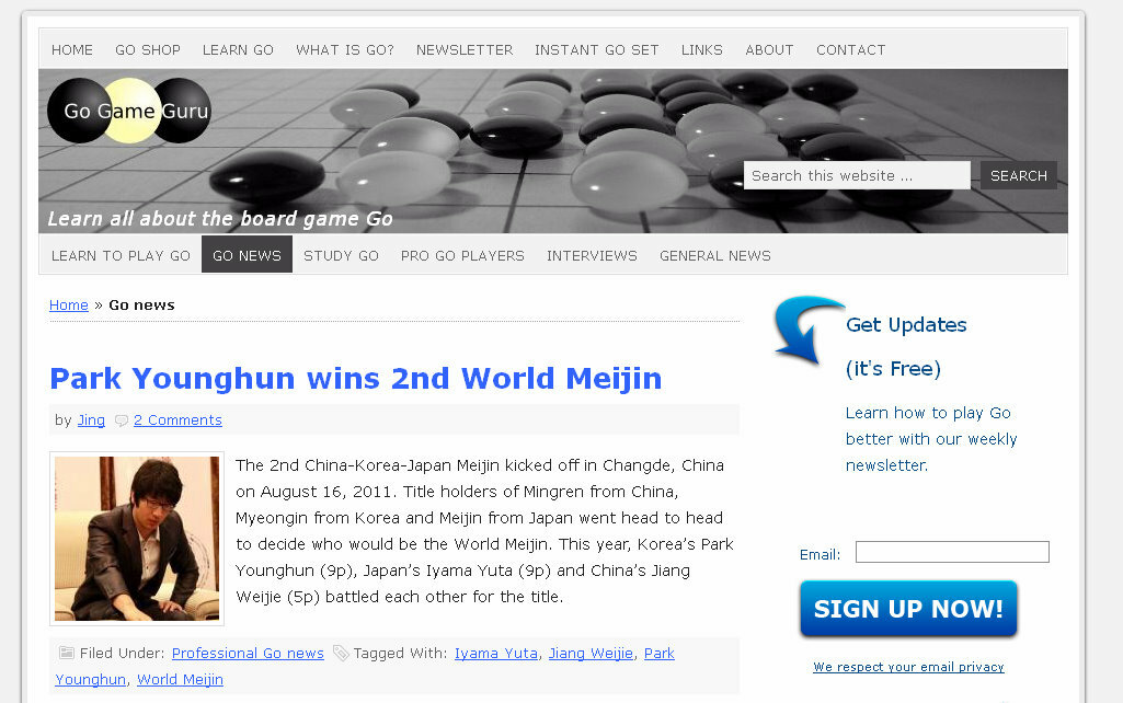 between two go players, Younggil An and David Ormerod – with regular contributions by Jingning – Go Game Guru provides reliable and well-produced international go news, as well as tips for how to improve at go, including lessons for beginners, study techniques, go problems and commentaries. Younggil An is an 8-dan professional go player with the Korean Baduk Association who won the ‘Prize of Victory of the Year’ in 1998. After completing compulsory military service, Younggil left Korea to teach and promote go around the world. He now runs