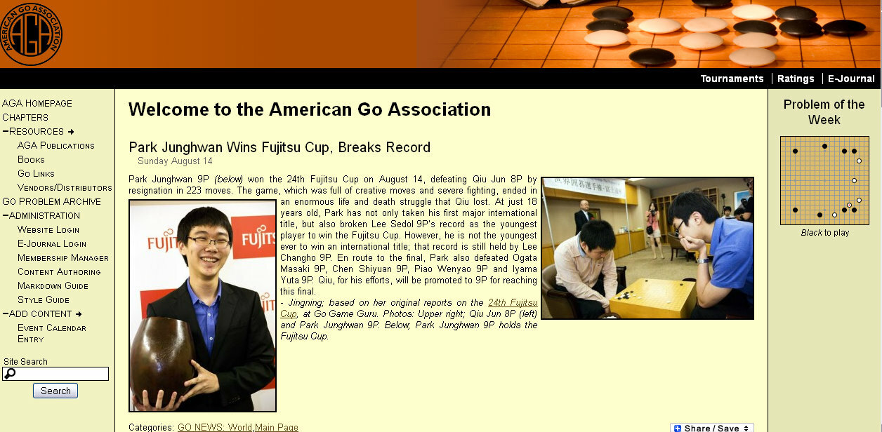 , and part of this project involves going through each existing web page and updating information to make it as current and useful as possible. We've already got a great team of volunteers working together on this exciting project, and could use a few more folks to finish up the project and get the new site launched. For example, our current World Amateur Go Championship page shows stats through 2010, so we need to track down who represented the U.S. at the 2011 WAGC and list how they did. No technical skills are required, and we expect this phase of the project to wrap up by the end of November. If you can help -- even with a limited time commitment -- contact Roger Schrag at
