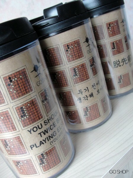 carries a neat line of go “tumblers” or insulated beverage containers. The Fuseki Series includes the Chinese Opening, Kobayashi, Mini Chinese Opening and San Ren Sei, and there’s also a Corner Problems tumbler and a Go Board tumbler. All are offered in English, Chinese or Korean. To carry your tumblers, and other go materials, the Go Shop also carries a go-themed tote bag. “For us, every small move counts,” says the Go Shop.