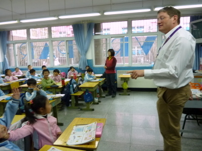 , the American team captain, dropped in on a lesson in a regular classroom to give some second graders a chance to practice their English. They peppered him with questions. Where do you live? Los Angeles. Do you like chicken? Yes. Do you also like duck? Yes. Do you like ice cream? Yes, I like it too much (patting midsection). After ten minutes or so, Okun ended the session with a question to the class: Do you like studying English? The class went wild in shouting Yes. Back in the go classroom the games were still in progress. On the whole, the pupils were acquitting themselves well but finding that without a handicap, beating world-class professional players and even world-class European amateurs and IGF Vice Presidents is not so easy. Unfortunately, the bus had to leave and some of the pupils’ parents had come to get them, so the games were cut short, farewells were bid, and a smiling group of players and officials returned to the Beijing Intercontinental Grand Hotel.