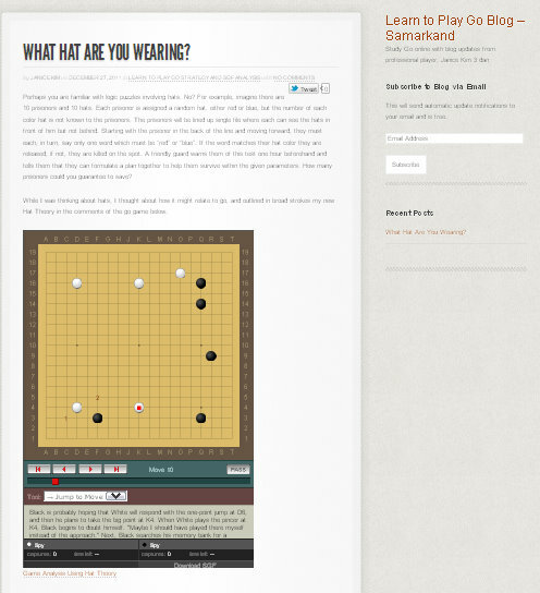 “No? For example, imagine there are 10 prisoners and 10 hats. Each prisoner is assigned a random hat, either red or blue, but the number of each color hat is not known to the prisoners. The prisoners will be lined up single file where each can see the hats in front of him but not behind. Starting with the prisoner in the back of the line and moving forward, they must each, in turn, say only one word which must be ‘red’ or ‘blue’. If the word matches their hat color they are released, if not, they are killed on the spot. A friendly guard warns them of this test one hour beforehand and tells them that they can formulate a plan together to help them survive within the given parameters. How many prisoners could you guarantee to save? While I was thinking about hats, I thought about how it might relate to go, and outlined in broad strokes my new Hat Theory in the comments of the go game