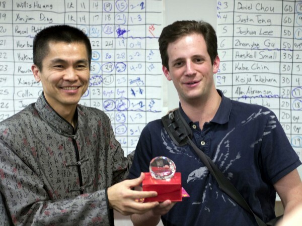photo: Ching-Sung Chin (left) presents winner's trophy to Josh Lee; photo by Gurujeet Khalsa