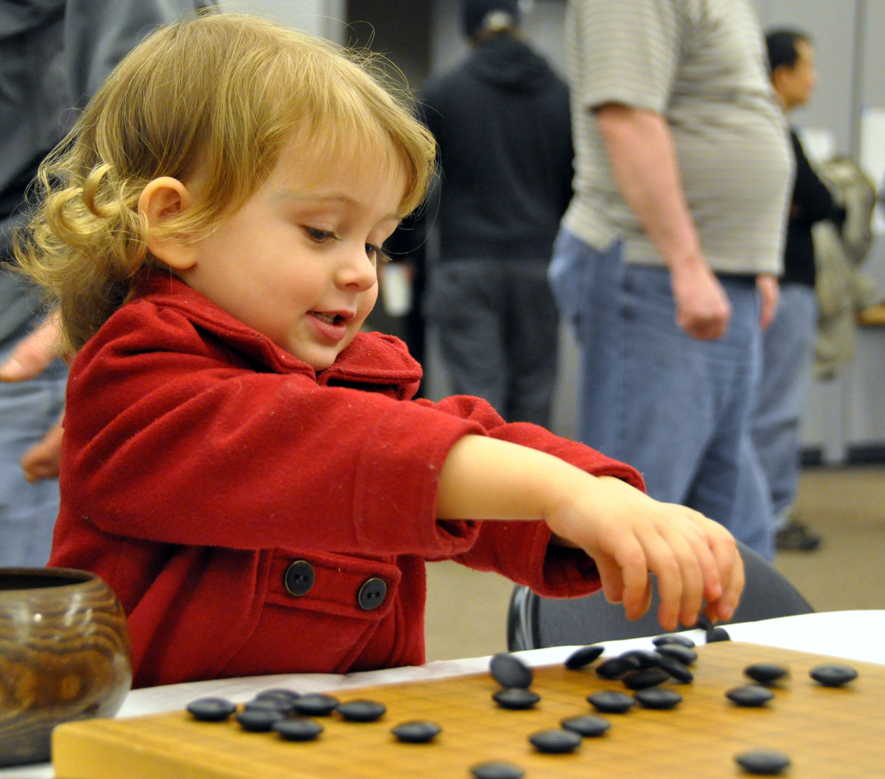photo: possible future NJO champion Yvette Lapidus, daughter of Carrie & Saul Lapidus, practices her two-handed tesuji Sunday, Feb. 26 at the NJO; photo by John Pinkerton.