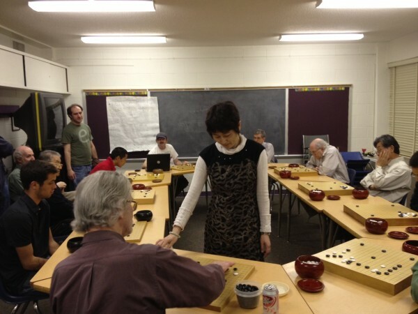 Abramson and club regulars” at the NOVA Go Club on April 16 reports Daniel Chou. “She graciously offered to play simuls with enthusiastic attendees led by Joshua Lee 6D and Haskell Small 4D,” followed by game analysis. The GWGC visit on April 20 “was a great success,” adds Haskell Small. “There were ten players in the simul, a number of others observing, and GWGC was rocking!” Ms. Yang plans to visit the Feng Yun Go School in New Jersey later this month.