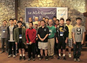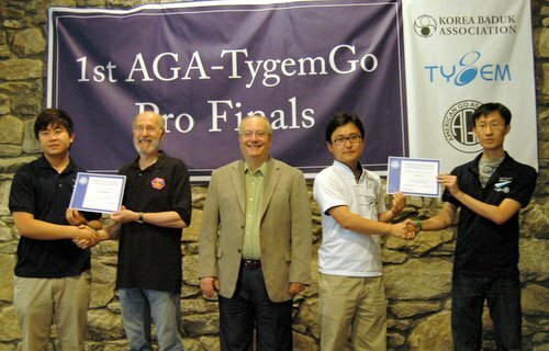 photos: top right: Shi and Liu receive pro certificates from Myungwan Kin 9P and AGA President Allan Abramson as TD Jeff Shaevel looks on (photo by Chris Garlock); middle left: Shi and Liu meet with Kim for a special welcome ceremony (photo by Chris Garlock); bottom right: the entire AGA-TYGEMGO Pro Finals group; photo by Nik Gonzales, Second Camera, The Surrounding Game