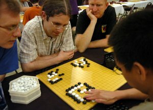 - Andy Olsen, TD; photo: Lee Huynh (r) and friends study life and death problems Thursday night.
