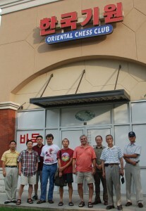 Photo from left to right: Yaofeng Wang, Lixian Liu, Junfeng Gu, Vladimir Rerikh, Yongming Zhuang, Jeff Kerlagon, Huan Tan, Song Kim, Youn Lee (in front of Mr. Kim's Baduk Salon)