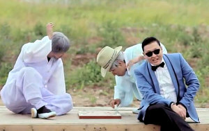 since its release last summer, inspiring parody clips from all corners of the globe. At .52 in the video there’s a 2-second glimpse of two game players behind South Korean singer and rapper PSY; several EJ readers have suggested that it’s go but it’s hard to tell for sure, even on close inspection. However, given go’s huge popularity in Korea, and PSY’s (born Park Jae-sang) attendance at Boston University and Berklee College of Music in Boston – home to a longtime go club – the appearance of the game is probably not that far-fetched.