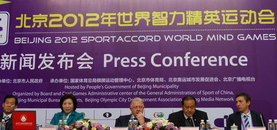 Executive President of the local organizing committee said at the December 12 press conference launching the 2012 SportAccord World Mind Games. Beijing’s all-out approach to the 2008 Olympic Games earned it a permanent Olympic legacy, added Hein Verbruggen, president of SportAccord. This year's Games have attracted extensive media coverage, reported David Neville, Director of SportAccord’s Multi-Sports Unit, with 24 platforms broadcasting to 64 countries, who noted that the event's preliminary online tournament attracted 380,000 amateur participants this year, five of whom won trips to Beijing...click here for