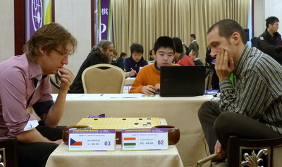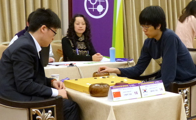 women competing. In the undefeated men’s section, China’s Chen Yaoye was matched against Korea’s Park Jeonghwan, and Koreans Choi Chulhan and Kang Dongyoon were matched against each other. In the undefeated women’s section, China’s Rui Naiwei was matched against Korea’s Park Jieun, a player who had occasionally managed to defeat her in title matches when Rui was playing professionally in Korea, and China’s Li He was matched against Korea’s teenaged Myung-in Choi Jeong. Most players took their seats early. Rui Naiwei and Choi Jeong spent the pre-game minutes meditating with closed eyes.In the repechage sections, the eight players who survived to advance into the fourth round were: Lin Chi-han of Chinese Taipei, who eliminated Csaba Mero of Hungary (‘His reading was too fast for me to keep up with,’ commented Mero); Lin Chun-yen