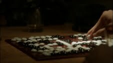 featured in the ABC series "Last Resort," episode 10 ("Blue Water"), which aired last Thursday, December 13. "The series is about a renegade U.S. submarine crew on an island in the Indian Ocean," explains Seifrid. "In this episode, a Chinese diplomat named Zheng visits the crew offering humanitarian aid. He meets with Captain Chaplin, who is wary of what strings might come attached with the aid. Zheng offers Chaplin his grandfather's go board as a gift. When Chaplin says he prefers chess, Zheng says 'In chess, the victor is the one who annihilates his opponent's armies. In weiqi or go, victory goes to the one who can control the most territory with the fewest armies.'" Later in the episode, they play a game against each other, and Zheng catches Chaplin in a trap, "exactly what Chaplin fears might be the real-life situation if he accepts Zheng's aid," says Seifrid. She sent along this screencap of the board during their game, noting that "Chaplin is black and Zheng is white."