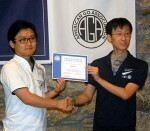 - photo: Andy Liu (right) receives his 1-dan professional certificate from Myung-wan Kim 9P at the 2012 AGA-Tygem Pro Tournament; photo by Steve Colburn