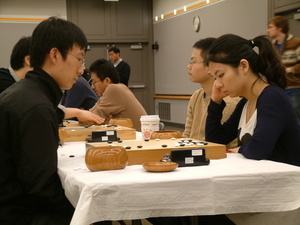, with Andy Liu emerging victorious. This is his second time as NJ State Champion. "Another highlight of the event was the drawing for the Beginner's Prize, which has been a feature of the NJO since 1990," reports organizer Rick Mott. The names of all players 15 kyu and below who completed at least three games were written on index cards, and the newly-crowned New Jersey Champion picked a card at random. This year, the winner was young Audrey Shin, playing in her first tournament. She was much too small to hold the box with a new board, bowls and stones, so it fell to her dad David Shin 4k, who also won a prize as a 4-game winner, to carry it home. "All in all, it was a pretty good day for the Shin family," said Mott.