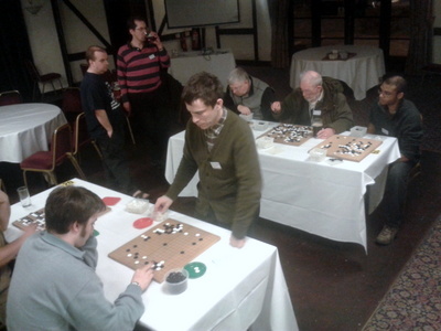 Each solution was followed by a detailed explanation of why he chose that particular move over others proposed either by him in a multiple-choice format, or occasionally from the floor. Three prizes of a special go fan went to those who got the most right. The fans were hand-decorated by Iyama Yuta 9P, current holder of six of the seven major Japanese titles, with calligraphy which Redmond translated as "play naturally." In the evening Redmond gave a simultaneous demonstration (above right), taking on five challengers at a time from a total of 10 playing in relay. Click here for links to all the games used in Redmond's teaching sessions, in zipped sgf format, courtesy of Tony Atkins. The events took place at the Cromwell Hotel in Stevenage, Hertfordshire, UK and were organized by Alison Bexfield 2d on behalf of the British Go Association.