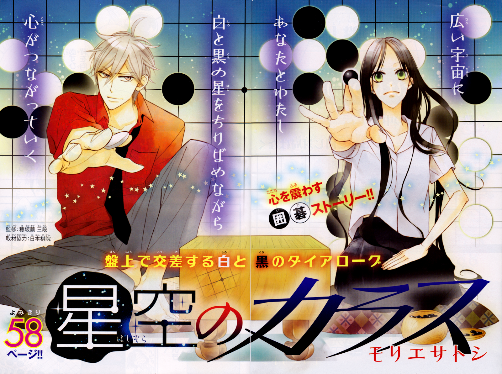 Crow in the Starry Sky, or Hoshizora no Karasu, as it is known in Japanese, is a new manga about go appearing in Hana to Yume magazine. The story centers around Karasuma Waka, a young girl who learned to play go from her grandfather, a professional who was despised by his family for placing go above his family life. Karasuma catches the bug though, and resolves to go pro no matter how her mother feels about it. No official translation has been announced, but fansubbers have picked it up and are posting chapters online. As with Hikaru no Go, this can help build a market for a series that might not otherwise get translated. The new manga is a shojo series, which means it is targeted at girls, and will feature both romance and in-depth characterizations. The first chapter has plenty of action on the go board though, and go players of any gender will enjoy the series. To download the original fansub, visit Pandascans. To read the series online, visit Kissmanga. Pandascans reminds readers that they do not own the rights to this manga, and ask that people support the author and the publisher by purchasing the manga when/if it becomes available in the US.