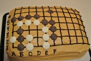 Fifteen prizes, most of them new books provided at a discount by Slate and Shell, were awarded to the top five finishers of each division. Nine-year-old Yitian Liu 2d, who won two of his games in the Open Division, captured the highly coveted cake problem prize, his winning entry selected at random from the other correct submissions. The wife of tournament organizer Richard Moseson has baked a problem cake (above; black to move) for the paired competition each of the last six years. - report/photos by Richard Moseson; photo: Xinde Ji (front left in vest) playing Phil Waldron (front right), Changtian Wang (to Waldron's right).