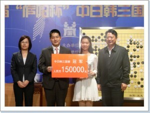 Professional Pair Go championship: The E-Journal reported on this tournament on May 6th. The Japanese Pair Go Association would like to add some details about the event. The official name of the tournament is the 1st China-Japan-Korea Professional Pair Go Championship. It is notable as the first purely professional international Pair Go tournament. The first tournament in which professionals took part was the Pair Go World Cup 2010, which was held in Hangzhou, China. It was organized by the World Pair Go Association, and a total of 16 professional and amateur players took part. This tournament was popular with spectators and go fans. This year’s event was organized by the WPGA with the cooperation of the Chinese Weiqi Association, Anhui Province and Hefei City. Matsuura Koichiro, President of the WPGA and former Director-General of Unesco, attended the tournament to give out prizes. A large number of photos and the game records can be found at the home pages of the Japan Pair Go Association and on the Pandanet page for the tournament.