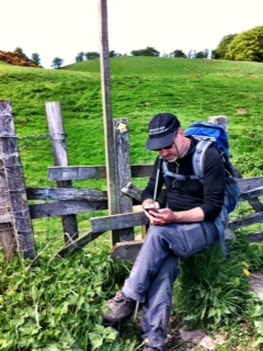 With just 73 miles left to go in his 200-mile Coast to Coast walk across northern England, E-J Managing Editor Chris Garlock took a tsume-go study break Wednesday on a fence stile outside Richmond (using