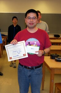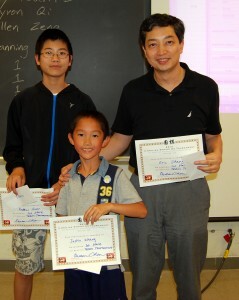 In the end, the Chinese School at Chapel Hill team consisting of Justin Zhang, Andrew Huan and their teacher Eric Zhang (right) won the team