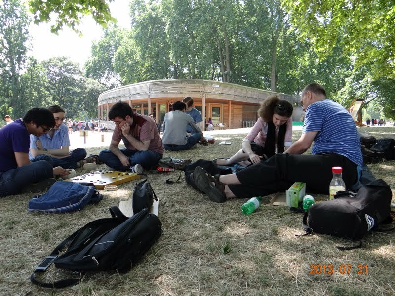 The Central London Go Club took advantage of the current UK heatwave to call a go picnic on Sunday, July 21. It was held in Royal St James's Park in the heart of the capital, adjourning later to the Captain's Cabin pub in Piccadilly. 14 answered the call and in addition, as organizer Julia Woewodskaya told the E-Journal, "There were quite a few spectators; some were asking questions about the game; one person was explained the rules and played at least one game." Click here for more photos.