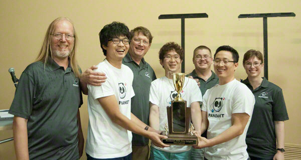 Andy Okun captained the LA team. "We're tremendously pleased with the results of our first year of the Pandanet AGA City League," League Project Co-Manager Jon Boley reported to Congress attendees Saturday night at a brief awards ceremony. Twenty eight teams competed in four leagues: LA won the A League, Toronto won the B League, Chicago won in C League, and Brentwood, TN won the D League. Karoline Burrall was the League Manager, Steve Colburn was the League webmaster and support was provided by Andy Okun and Thomas Hsiang. The EJ's Andrew Jackson and Dennis Wheeler recorded the Board 1 and Board 3 games.