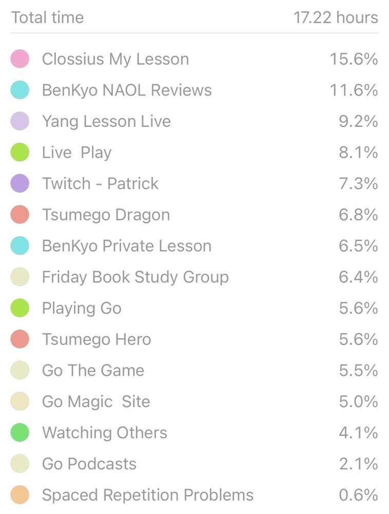 Last week was a moderately active week for go activities. I put in over 17 hours. I did manage to get in a bit of time on my Internet Go School Spaced Repetition problems. I missed one day and am down to 12 vacation days. I have to be more vigilant.