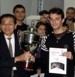 BURZO WINS ROMANIAN AMBASSADOR CUP: Cornel Burzo 6D won the Romanian Ambassador of Japan Go Cup held December 13-14 in Bucharest. Lucian Corlan 5D took 2nd place and Daniel Cioata 5D was 3rd in the second edition of the event in which 150 Romanian Go players from 6 to 60 years old played. The event was also the occasion for the launch of Pro-G0, the new Romanian electronic go publication by Dorin Chis. - report by Marilena Bara, Romanian correspondent for the E-Journal; photo: Burzo (r) with Ambassador of Japan in Bucharest Yoshinobu Higashi; photo by Liviu