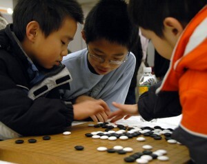 Well over 100 players are expected at the New Jersey Open this weekend in Princeton, NJ. The 51st annual tournament is one of six events this weekend across the country, including the triple-threat Southern Cal Championship, US Youth Qualifier and NAMT/FUJITSU Qualifier in Alhambra, CA, the Chinese Spring Festival tournament in Columbus, OH and the John Groesch Memorial tourney in College Park, MD. “Princeton’s own Zhaonian (Michael) Chen ’11, who missed last year’s 50th anniversary NJO due to a schedule conflict, will play this year,” says NJO TD Rick Mott. “He has won in the past and it should be a great group of strong players contending for the title.” Also, Mott reports, “Feng Yun 9P has cancelled her classes for this weekend in order to allow her students to attend, so the expected total over both days is around 120 players.” Look for top boards to be broadcast live on KGS by the E-Journal. Look for top boards to be broadcast live on KGS by the E-Journal. Photo: young players review game at 2009 NJO;