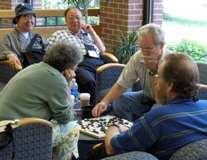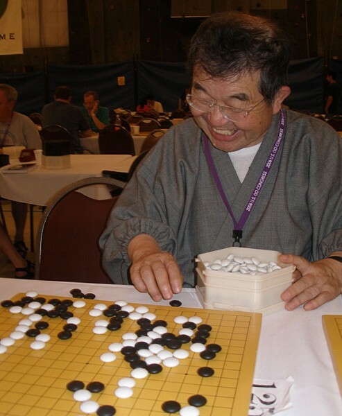 Longtime Congress favorite Noriyuki Nakayama 6P announced at the 2006 US Go Congress that it would be the last year he’d be attending the U.S Go Congress. His wife had been ill recently and it was a great hardship for him to be away for the month it took to attend both the U.S. and European Congresses. At a standing-room only lecture at the Congress, the irrepressible Nakayama said that “I’m afraid the answer might be ‘jigo’ if my wife asks me which is more important, my American go friends or her.” Much-loved for his cherubic delight in teaching go to players of all strengths, Nakayama said “The best thing about go is that you make many friends.” At the lecture, he set up two life and death problems and invited members of the audience to come up and try to solve them, gleefully refuting the wrong moves until somebody solved the problem correctly. For the game section of the lecture, he showed part of the game he won to get promoted to 2P.