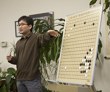 MYUNGWAN KIM 9P WORSHOP GIVES NORCAL PLAYERS A BOOST: Thirteen students gathered last weekend to listen to lectures, ask questions, solve problems, have their games reviewed, and play against Myungwan Kim 9P, a top pro from Korea and winner of the U.S. Open two years in a row. At the March 20-21 workshop in Berkeley, CA, Kim took questions from students, and spent a lot of time discussing techniques for assessing the value of different endgame moves, a popular topic among the attendees. The workshop was sponsored by