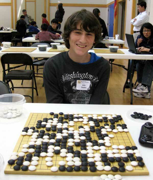 Players Association's monthly ratings tournament in Palo Alto, CA, on April 10. Kfir Dolev 5k (r) and Larry Qu 6k each went 4-0 to top the kyu division. Anthony Chiang 2d earned an honorable mention for completing a whopping ten games, a dan division record. "Our flexible tournament format lets people play as many or as few official games as they like," explains tournament organizer Roger Schrag. Twenty-nine adults and children played, ranging from 24k to 5d, with eight of the 29 playing in their first tournament ever.