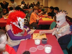 Friday and Saturday was so popular that "the crowds never seemed to let up, and we kept teaching until midnight both days!" reports local organizer Mark Rubenstein. "ACEN is a huge event, with 15,000 attendees last year," says Rubenstein. "The go club has our own room with dozens of 9x9 boards available for learning. The room was full of enthusiastic, costumed first-time go players, some of whom spent hours enjoying their first foray into go." The club also held a tournament on Saturday, and gave away 8 full-size go sets, provided by Yellow Mountain, to the top eight winners. For more pictures of the "wacky, wonderful world of ACEN," check out the club's