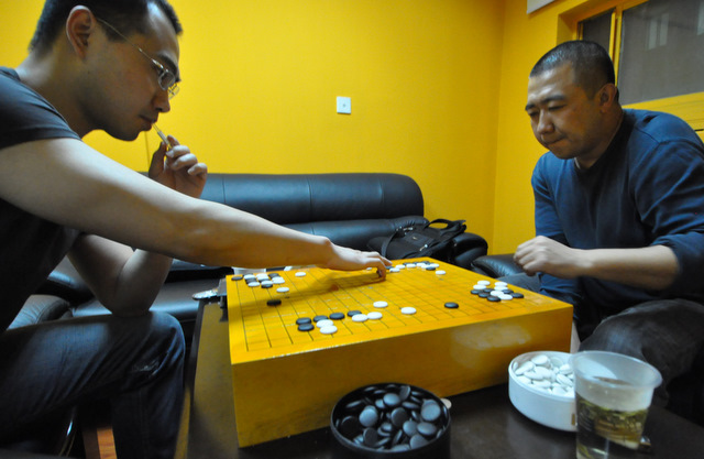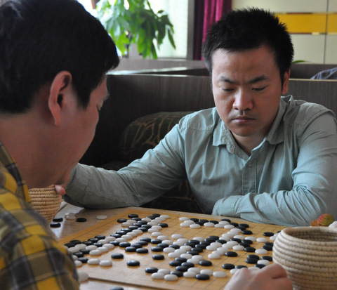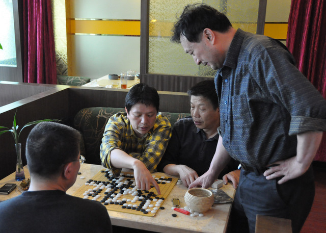 told us. "It's easier just to play on the Internet, and it's free." Still, Danny and his friends -- all very strong dan players -- prefer to hang out at the coffeeshop on the weekends and they welcomed us to the gang, keeping our glasses filled with tea, showing us how to peel ripe lychee nuts and taking turns giving us games. "Go is a good way to make new friends," Danny said. The afternoon slid by as rain pattered outside and stone