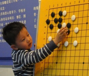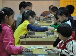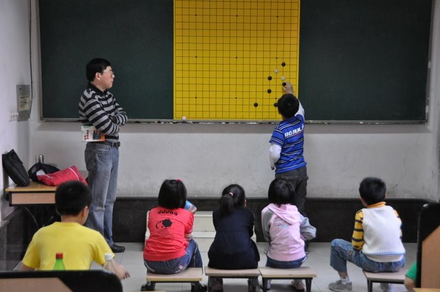 daily, with cultural lessons in the morning and then go lessons in the afternoon and evening. Tonight's classes are levels 2 through 5. The Level 2 kids -- who teacher Bai Yi Ping has to lift onto a chair to reach the demo board -- are 8 kyu and are learning to count liberties.