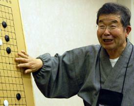 contemplate the oversize photos showing Nakayama watching the legendary Go Seigen play tournament games. Nakayama’s appearance had not changed much over the years. There was no mistaking the impish smile, the shock of hair. Nakayama’s poetry was also displayed, with each stanza introducing another archaic, almost forgotten character of the ancient Japanese alphabet. In the next room, we paid our respects to Nakayama’s family and to Nakayama while a priest intoned the sutras before Nakayama’s photo, framed in an array of blue and white flowers. We gathered for a meal, after which several people spoke, including Otake Hideo 9P. Takemiya Masaki 9P spoke of Nakayama’s many books and how he had been the choice of so many top go professionals as their ghost writer because of his comprehensive knowledge of go as well as his skillful writing. Michael Redmond 9P also spoke, noting that Nakayama had been very popular in the United States, where he was a frequent and longtime visitor at the annual U.S. Go Congress. Nakayama touched many of us with his wit and wisdom, and the memorial service captured the quiet stillness that grounded both.
