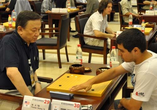 winning their games handily. In North America, Thomas Hsiang 7d (US, left) beat Sotirios Ioannides 1k of Cyprus (r), Canada’s Yongfei Ge 7d defeated Alexey Lazarev 6d of Russia and Mexico's Emil Bustamente 5d beat Janez Janza 3d of Slovenia. One unexpected result among European players was Thailand’s Kamon Santipojana 4d’s win against Romania’s Lucian Corlan 5d. By 6A EST, a complete first-round report – and perhaps a preliminary Round 2 report – will be posted on both the