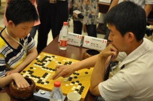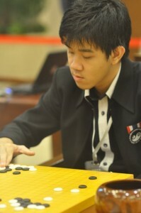 produced a boatload of interesting matches in the third round Thursday morning. Taewon Jo of DPR Korea, who had defeated Yohei Sato of Japan in the second round, now found himself facing 11-year-old Cheng-hsun Chen of Chinese Taipei. The game began with two variations of the avalanche joseki in adjacent corners, leading to a large-scale game with each side amassing over a hundred points worth of territory, including captured enemy groups. Facing an imperturbable opponent, Chen appeared to be in a state of high anxiety in the middle game as referees, reporters, and players whose games had already finished began to gather around the board to watch. At the end, however, he was playing with quick confidence, wining on the board without needing komi.