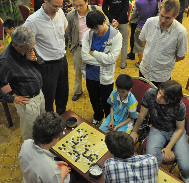 round had just concluded a few hours previously, but the casual player’s room was jammed with WAGC players taking on young dan students from the Hangzhou Go Association who were equally eager to take on the world’s best amateurs. The kids played with blazing speed as the older players – even 17-year-old Thomas Debarre of France was an oldster compared to the six- and seven-year-olds -- muttered their disbelief – and appreciation -- in a dozen languages.