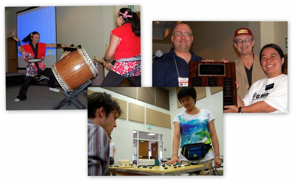 globe. As players checked in at the University of Colorado in Colorado Springs, Colorado, the main playing area filled up with go players engaged in friendly games and there was even an impromptu simul as Qiao Shiyao 1P played a 3-on-1. Later, there was a taiko drum performance, welcoming ceremonies – including the official Go Congress Director plaque transfer from last year’s Congress Director Todd Heidenreich to this year’s Co-Directors Karen Jordan and Ken Koester.