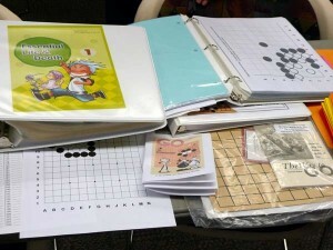 , paper boards, and various other handouts so that they have something to read as well as a way to play before the next meeting. It is important to recognize that different kinds of students have different needs, Hey said. Adults "need to be assured that they are learning something worthwhile," while kids want to start playing "before they know where the stones go." Presenting some go history and the names of famous players is useful when introducing adults, but not for kids. In addition to her presentation, Hey also brought a lot of her teaching materials (r) to show to the other teachers.
