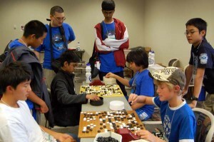 , was also popular, with nine teams competing. Top honors went to Keiju Takahara, Oliver Wolf and Takashi Hoshi in the dan division, and Anurag Varma, Albert Hu, and Alvin Hu in the Kyu division. Both teams are playing in the photo at right, while Winston Jen (third from left, standing) observes the match.